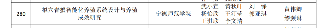 近日,第十七届“挑战杯”福建省大学生课外学术科技作品竞赛结果公布。经过激烈角逐,我院黄伟卿、缪颢琳教师指导的《拟穴青蟹智能化养殖系统设计与养殖 成效研究》项目获省赛三等奖。