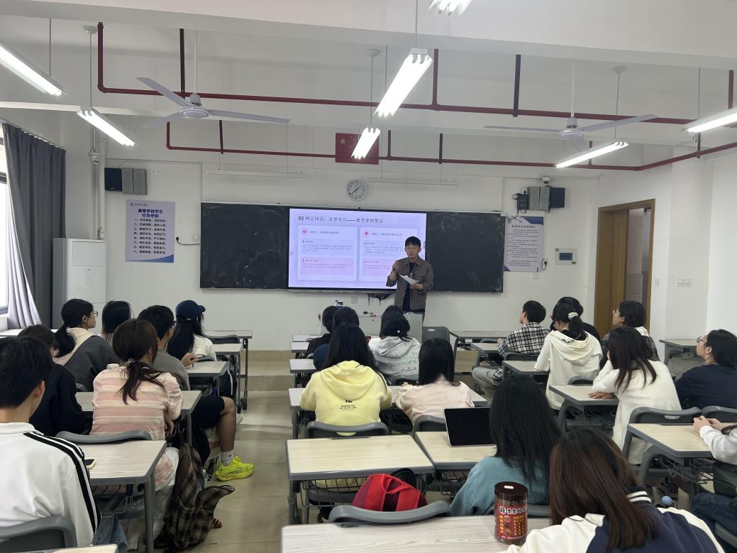 在网络言行规范环节,依据《计算机信息网络国际联网安全保护管理办法》《治安管理处罚法》等法律条文,重点讲解了网络诽谤的认定标准,并通过“微博造谣被判刑”“网络暴力致人自杀”等典型案例,警示同学们网络绝非“法外之地”,要理性发言、核实信息、保护隐私、依法维权。针对学术诚信问题,详细解读了教育部《高等学校预防与处理学术不端行为办法》,列举了剽窃、篡改、伪造数据、买卖论文等七类学术不端行为及其严重后果,并结合《国家教育考试违规处理办法》及刑法中“组织考试作弊罪”“代替考试罪”的条款,提醒同学们诚信应考,切勿因一念之差从违纪走向犯罪。