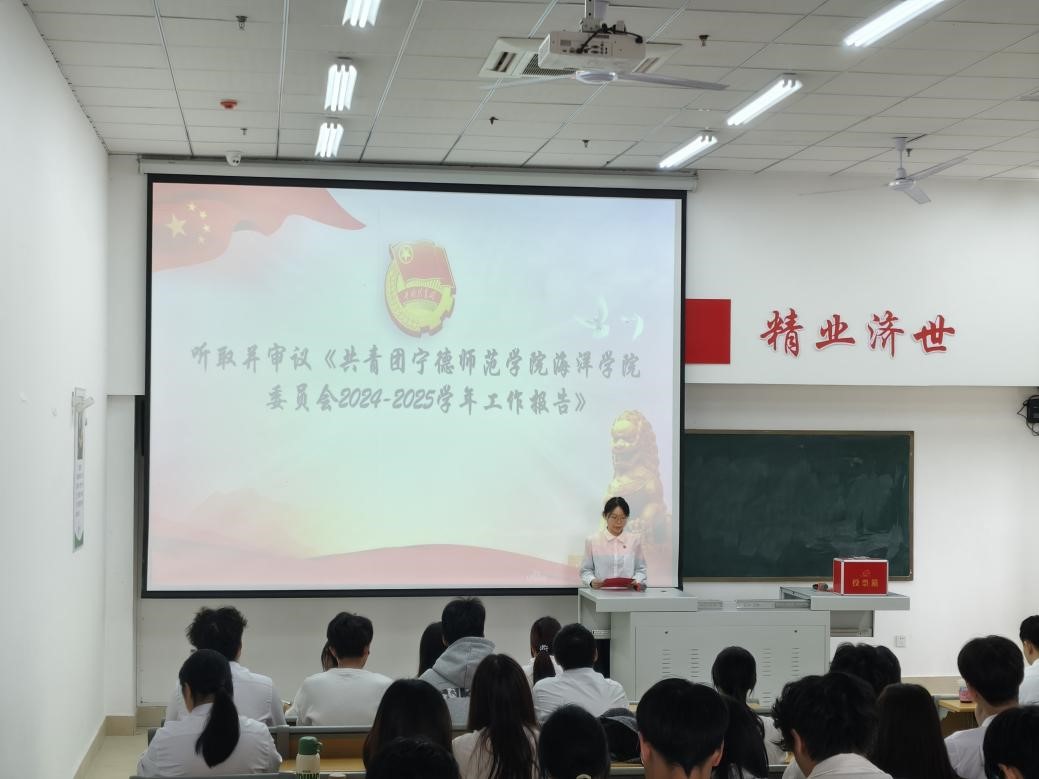 随后,会议进入听取审议环节。全体代表共同审议了共青团宁德师范学院海洋学院委员会2024-2025学年工作报告。报告全面回顾了过去一学年我院团委在思想引领、组织建设、校园文化、实践服务等方面取得的积极成果。