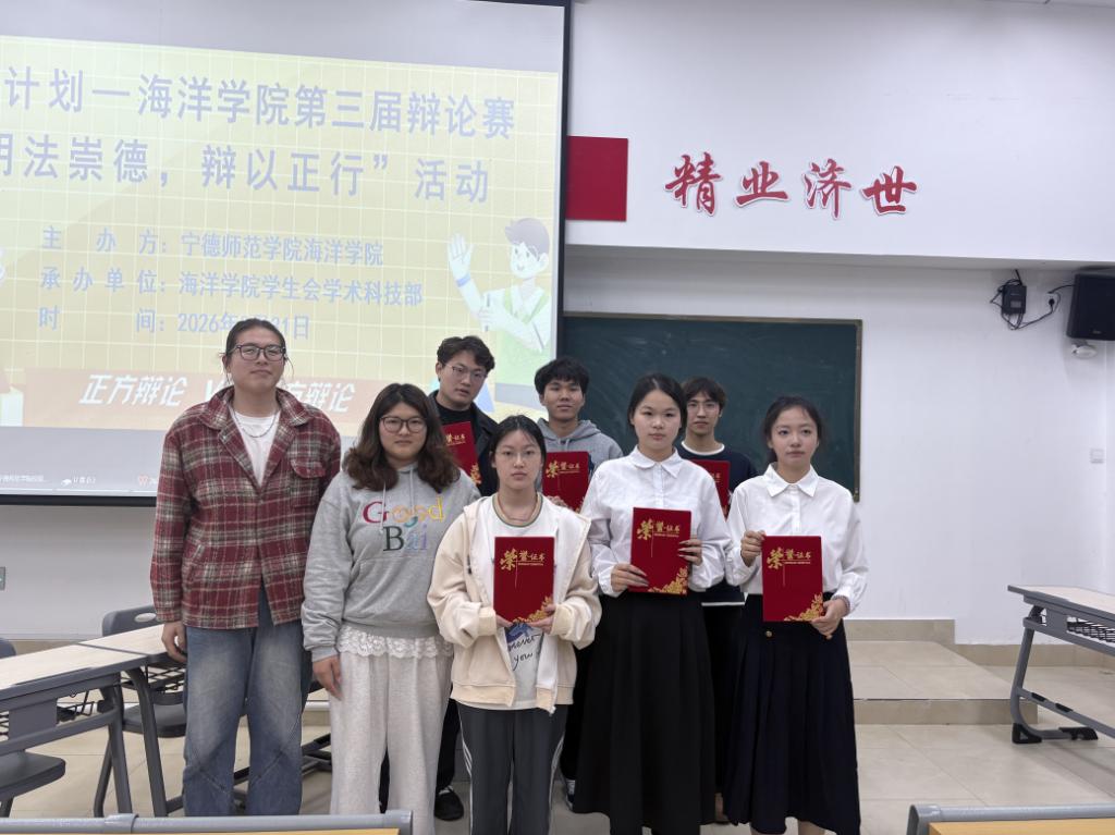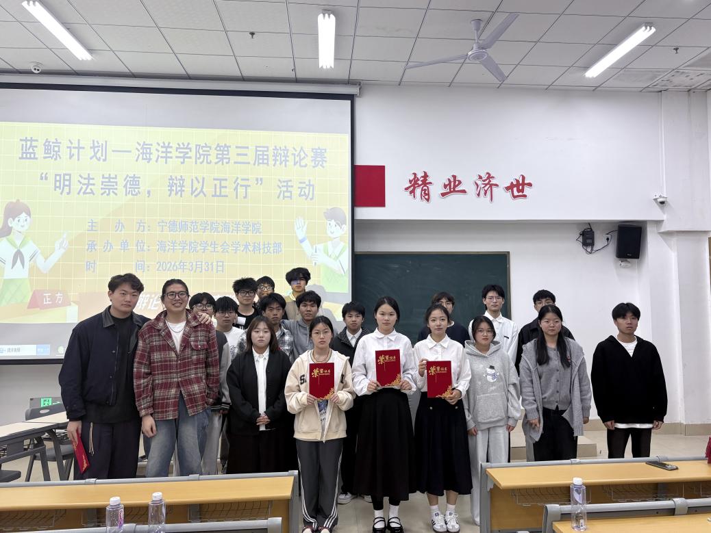 2026年3月31日海洋学院在医教楼101开展海洋学院第三届辩论赛“明法崇德,辩以正行”活动(获奖同学合照)