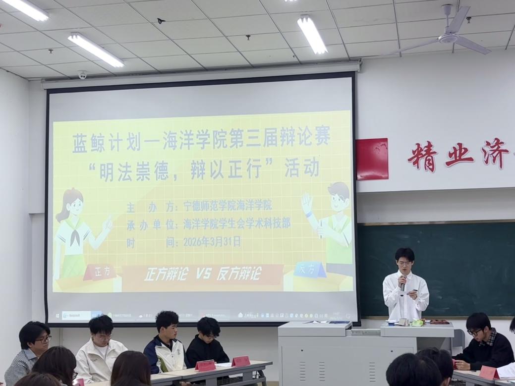 为进一步加强法纪教育,锤炼学生逻辑思维与语言表达能力,培养新时代青年的理性精神与时代担当,海洋学院于2026年3月31日在医教楼101顺利举办“明法崇德,辩以正行”为主题的第三届辩论赛。本次活动全院各年级学生踊跃组队参赛,为现场观众呈现了一场场精彩的思维交锋。