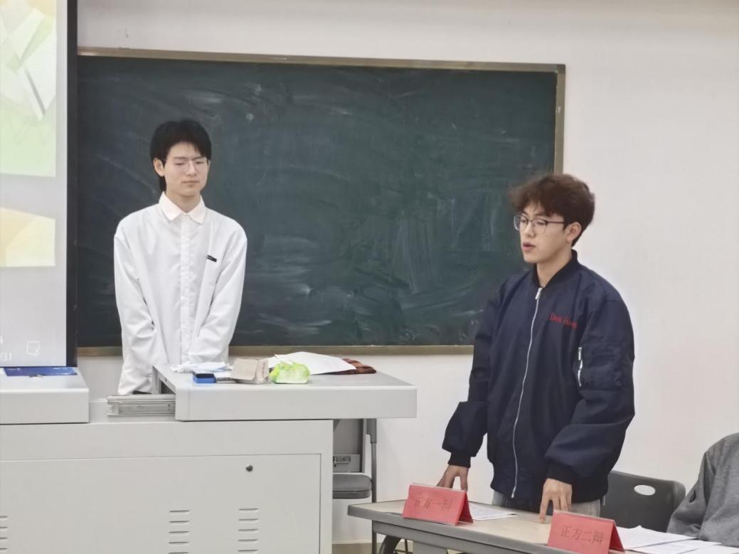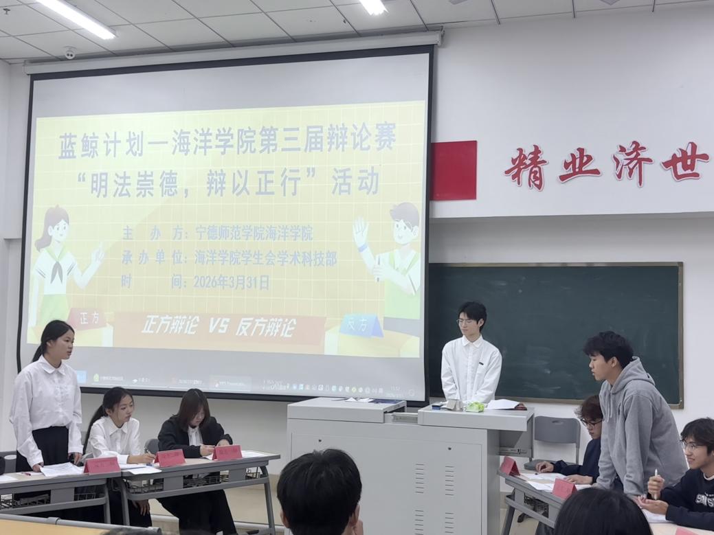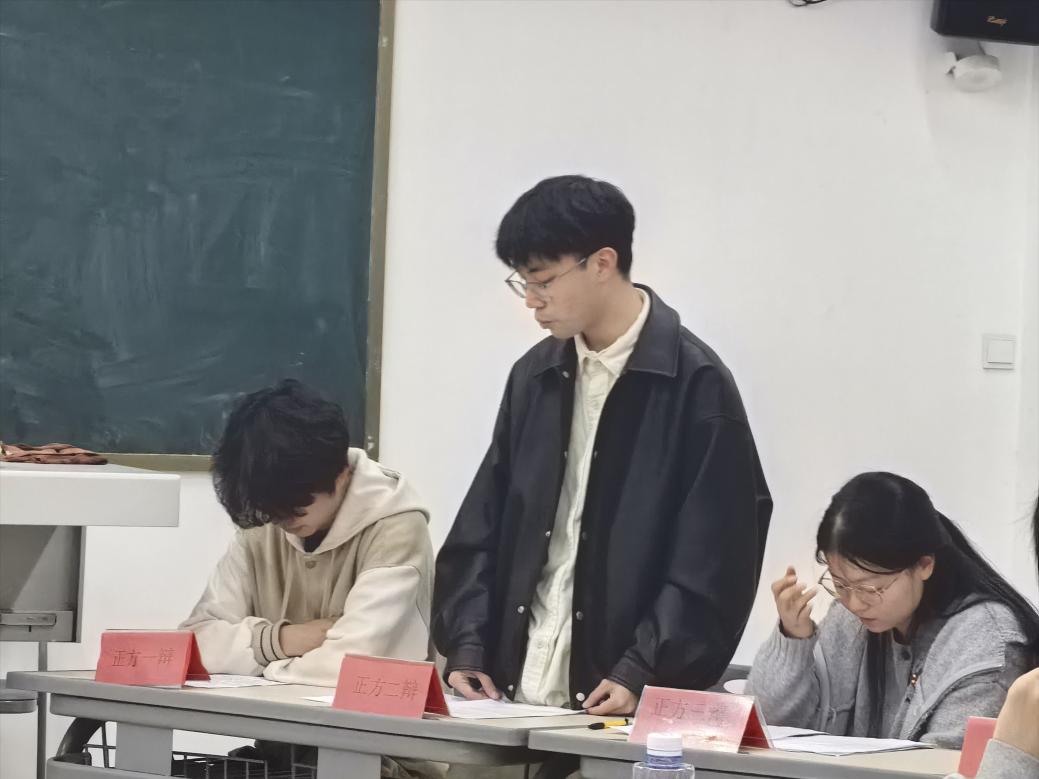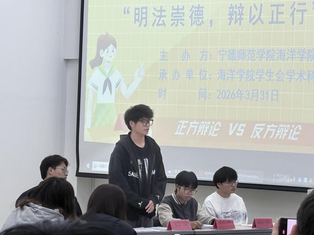 2026年3月31日海洋学院在医教楼101开展海洋学院第三届辩论赛“明法崇德,辩以正行”活动(第二组正方二辩发言)