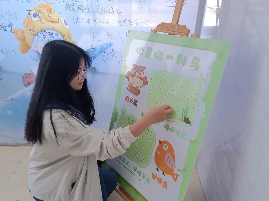 线下打卡互动,培育规律作息习惯。针对学业压力、电子产品依赖等因素导致的大学生作息紊乱问题,3月20日至26日,海洋学院在医教楼六楼举办睡眠主题展板打卡活动,打造沉浸式体验场景。活动现场,学子们积极参与,在主题展板上写下专属睡眠寄语,定格对健康作息的期许并合影留念。在“你是哪一种鸟”趣味展板前,大家根据自身睡眠习惯,在“闻啼鸟”与“猫头鹰”之间做出选择,并贴上印有学院IP“鱼丸”图案的专属贴纸。通过现场交流与体验,学子们纷纷表示将主动加强自我睡眠管理,摒弃熬夜陋习,养成规律健康的作息习惯。