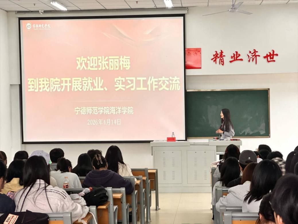 为深入贯彻落实我校2026年春季促就业攻坚行动部署,充分发挥优秀校友的榜样引领作用,帮助在校生树立正确的就业观、择业观,2026年4月14日,海洋学院在医教楼101成功举办《青柠职说》系列讲座之“工者匠心”:民生冷暖系于心。本次讲座特邀海洋学院2021级海洋资源开发技术专业优秀毕业生、现就职于屏南县古峰镇人民政府的“三支一扶”骨干张丽梅学姐担任主讲人,学院各年级学生代表到场聆听。