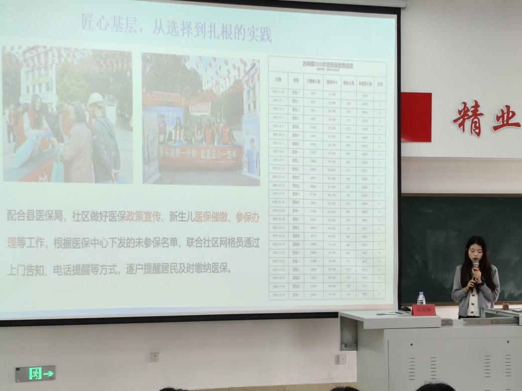 讲座伊始,张丽梅以“勤学笃行,我的大学成长路”为切入点,深情回顾在校期间担任班级团支书、学生工作办公室助理的经历。她表示,正是这些组织协调、服务同学的学生工作,培养了她严谨细致的工作作风和统筹执行能力,为后续扎根基层打下坚实基础。随后,她围绕“匠心基层,从选择到扎根的实践”,分享从岗位选择、报名准备到正式服务古峰镇,负责医保、社保、关工委等民生工作的真实状态。她特别提到,面对医保催缴、台账核对、助学审核等琐碎任务,自己从“理论认知”转向“落地执行”,从“单一任务”转向“多线作战”,用耐心、细心回应群众期待。